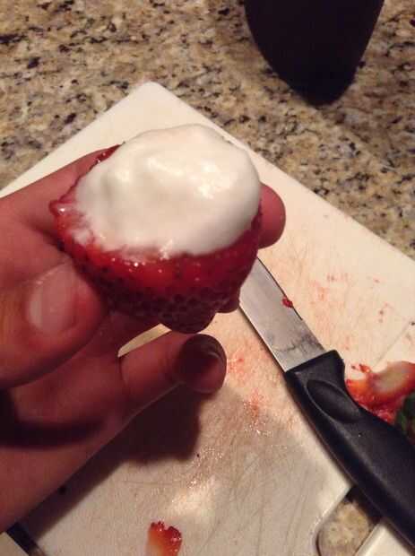 ver cómo puede sobornar a Santa a ser regalos más usando estos sombreros de Santa fresa lindo y simple.Para instrucciones y receta completa por favor visitan mi artículo original a continuación:Lo que usted necesita10 fresasglaseado de 1/2 taza crema