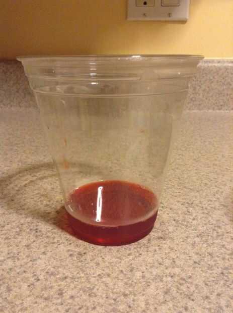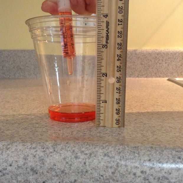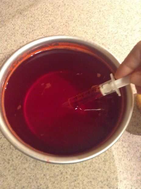 Vierta con cuidado la gelatina roja en una copa claro mediante la transferencia de la olla con el gotero de medicina. Coloque una regla vertical al lado de la taza y continuar hasta tener una capa de aproximadamente 1/2 pulgada. Poner la copa en la nevera durante 20-30 minutos.