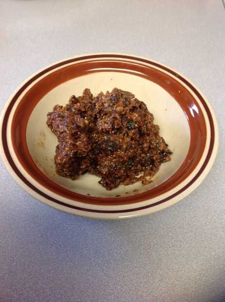 Mezcla los higos, las pasas de uva, jugo de manzana, jugo de limón, canela y jengibre en una pasta para crear el relleno. (La mezcla estará bastante gruesa).