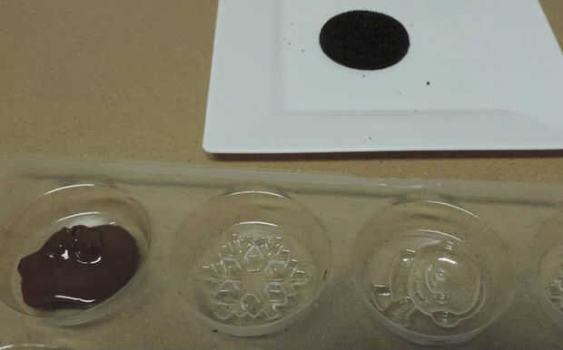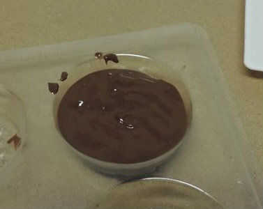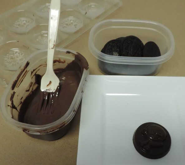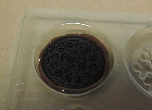 Tomar un recipiente para microondas y poner el chocolate en él. Me gustaría trabajar en lotes pequeños por lo que sólo me derrito tanto como es necesario por la cantidad de golosinas en el molde. Ponga el chocolate en el microondas y calor durante 30 segundos. Seguir calentar y mezclar con un utensilio de plástico o un pincho de comprobación y revolviendo frecuentemente. No cocine demasiado ni quemar el chocolate. Cuando el chocolate esté casi todo derretido retirar del microondas y utilizando una cuchara de plástico Coloque un charco (que es un término técnico) de chocolate en uno de los compartimientos del molde. Tomar una galleta la mitad y colocar en el molde encima del Charco. Con un pincho empuje hacia abajo en la cookie hasta que el chocolate fluya para arriba sobre la espalda. Tirar el chocolate en el centro para cubrir. Si no cubre agregar más chocolate. Continúe hasta que todos los compartimentos del molde se llenan. Golpear suavemente el molde sobre el mostrador para alisar la parte de atrás y liberar cualquier burbuja. Coloque el molde en el congelador. Cuando el chocolate está listo para ser extraído del congelador, revise la apariencia. El chocolate habrá perdido su aspecto esmaltado y algo aburrido.