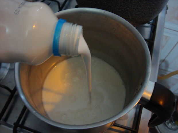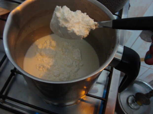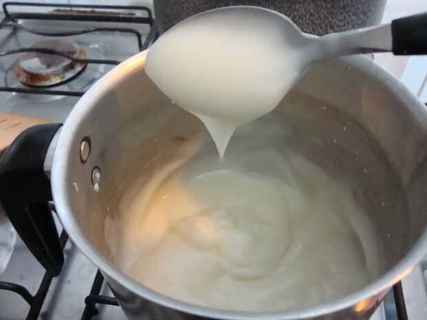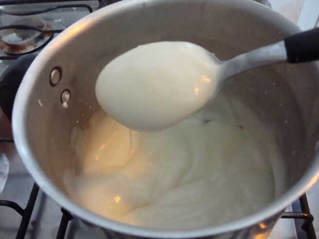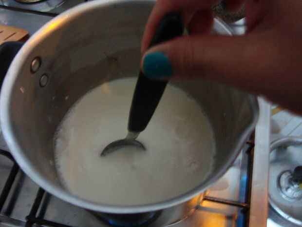 - En una cacerola, poner la leche de coco y leche de vaca y mezclar con la maizena y el azúcar.