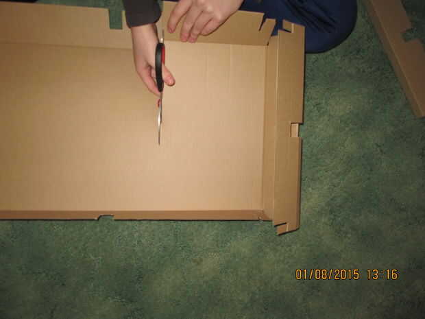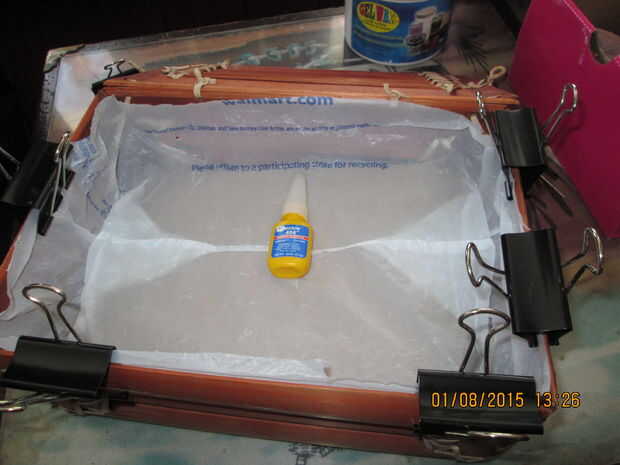En primer lugar, coloque la bolsa de plástico dentro de la caja y corte que encajan justo en la parte superior, luego llevarlo hacia fuera. Luego cortar el cartón y colocarlo en la caja dejando al menos 2 a 3 pulgadas en la parte superior. Luego coloque la bolsa de plástico en la caja sobre el cartón y usar el pegamento para pegar la bolsa de plástico para el borde de la caja. Esto asegurará que el yeso de París no se fugas a través de y fuera de la caja. Use los clips de la abrazadera para sostenerlo hasta que esté seca y hasta que el yeso se seque así.