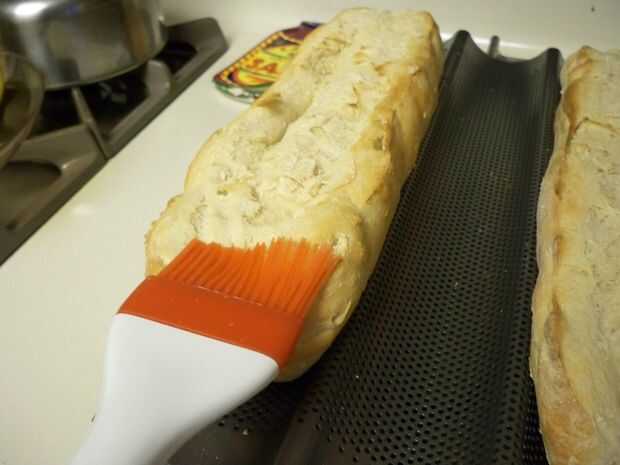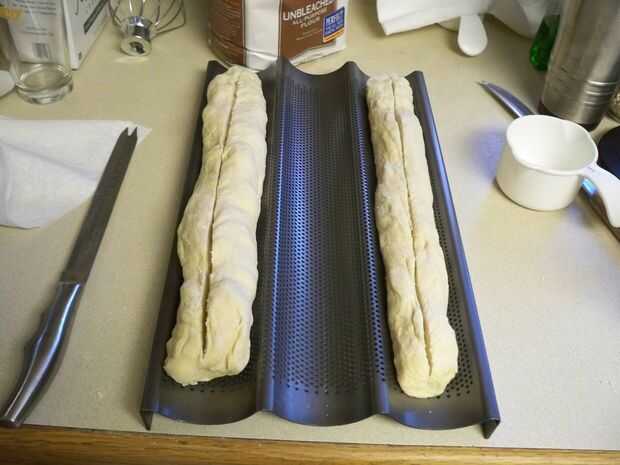 Hacer 2 baguettes pequeñas. Cortar la masa en 2 trozos. Luego estirar y moldear la masa en un registro. Si tienes el molde de pan de lujo, coloque allí, si no, colocarlas en una bandeja con harina de maíz en la parte inferior. Cuando la masa esté lista para hornear, tomar un cuchillo y cortar la parte superior de la masa. Considero que un solo corte que se extiende de extremo a extremo funciona mejor.