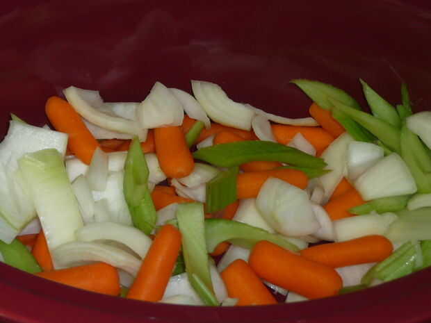 poner la cebolla, el apio y las zanahorias en la olla olla y girar a la baja (de 8 horas o alta para 5-6 horas)