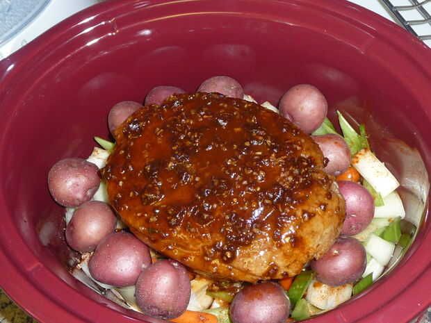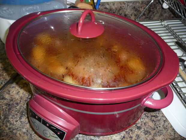 Agregar bebé papas o patatas medianas en cuartos, cubrir y set de 7-8 horas en bajo o 4-5 horas en lo alto. A pie.