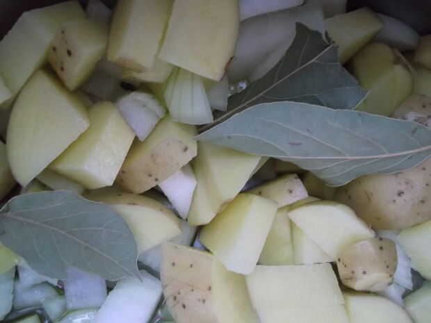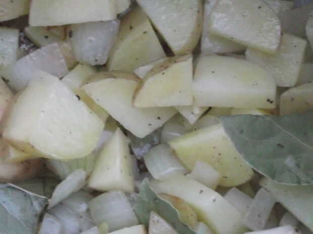 • calentar una sartén grande y agregar el aceite de oliva antes de añadir el preparado patatas, cebolla, ajo y hojas de laurel - ablandar durante unos 5 minutos