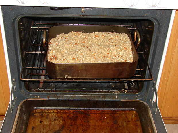Coloque la bandeja en el horno. Vas a mezclar la granola cada quince minutos durante una hora y quince minutos. De esta manera obtiene un color uniforme.