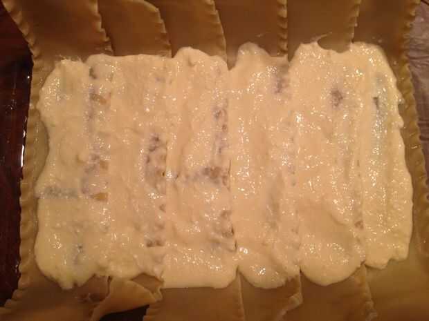 10. colocar la mitad de la mezcla de queso ricotta y huevo sobre los fideos, usando la cuchara o una espátula de goma para extender suavemente la mezcla para la cobertura uniforme. Luego, coloque la mitad del queso mozzarella en rodajas o en cubos sobre la capa de ricotta.