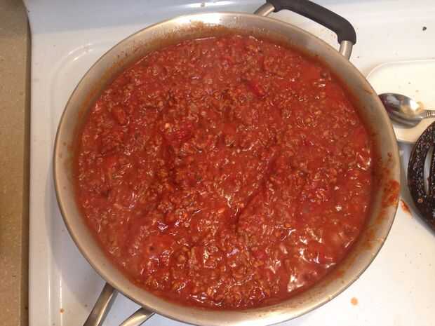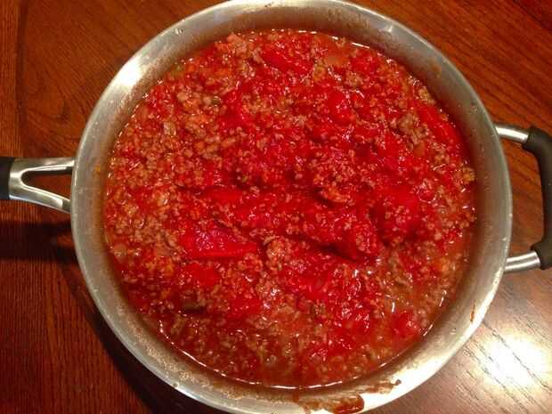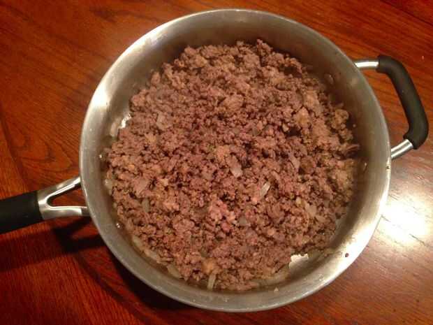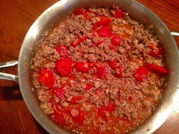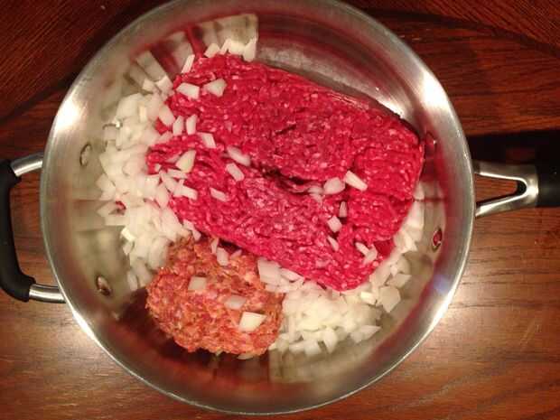1. en un sartén de 12 pulgadas o 5 cuartos olla sobre fuego medio-alto, cocine la carne molida, salchicha y cebolla picada hasta que esté dorada la carne y la mayoría de los jugos de la cacerola se ha evaporado. (Tiempo de cocción: 15 minutos)