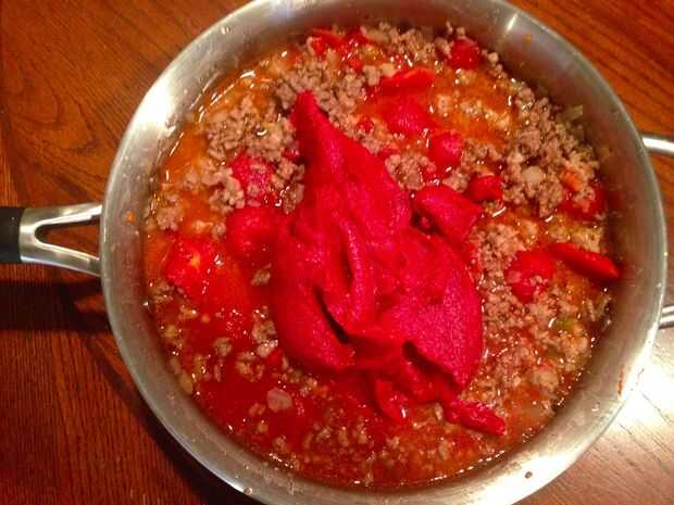 2. agregar los tomates, rompiendo si es necesario, luego agregue la pasta de tomate. Lentamente revuelva o doblar la pasta de tomate en el resto de ingredientes hasta que todo está bien mezclado.