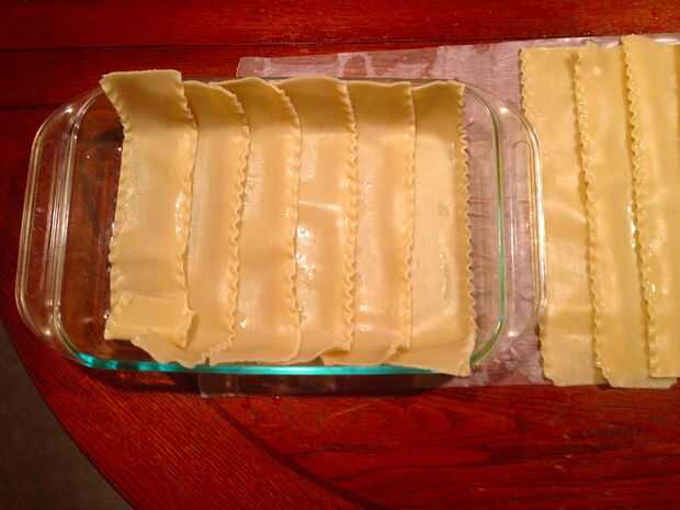 9. en la 13 x 9 pulgadas para hornear pan, arreglar la mitad de los fideos, superpuestas para adaptarse.