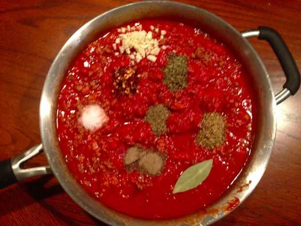 3. Añadir el ajo, albahaca, orégano, tomillo, pimiento rojo triturado, sal, pimienta y laurel a la cazuela. Mezclar bien. (Tiempo para los pasos 2 y 3: 5 minutos)