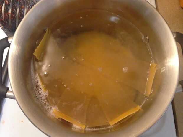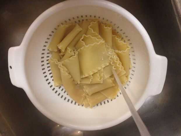 5. en una olla grande, cocine la pasta de lasaña ya dirige la etiqueta, generalmente 10-12 minutos. Sesión para el límite de tiempo inferior si prefieren los tallarines al dente y asegúrese de remover para separar los fideos. Escurrir bien en un colador. (Nota: Añadir unas gotas de aceite de oliva al agua puede ayudar a que tus fideos de lasaña no se pegue.)