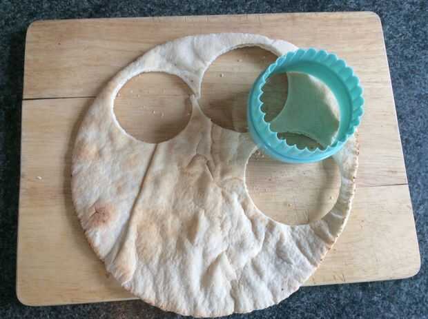 Base: usando un cortador de galletas, cortar 6 bases. Utilicé un cortador de 78 mm o 3 1/16 de pulgada. Cualquier menor y no tienes suficiente hacia los lados. Usted podría ir más grande, pero se advierte que la base de la pizza es más probable que romper.