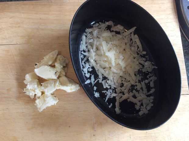 Queso: rallar aproximadamente 1/5 de una cuña de parmesano, arrancar algunos mozzarella para que tenga trozos grandes de 6 o 12 pedazos más pequeños.