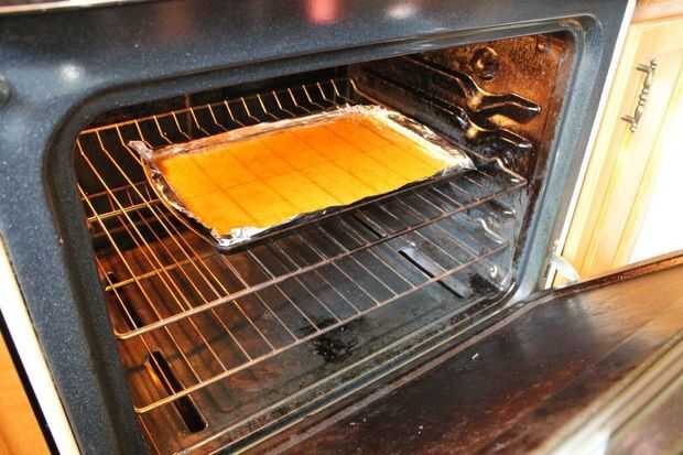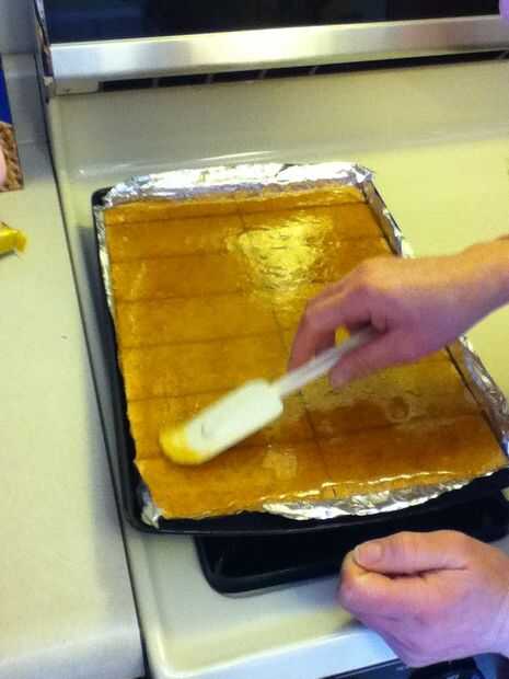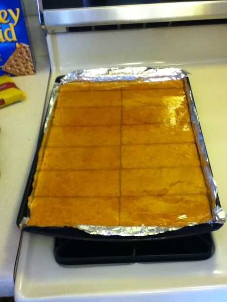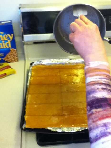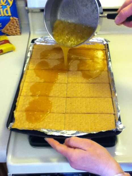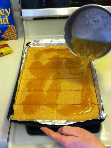 Verter la mezcla de mantequilla/azúcar sobre las galletas en la bandeja para hornear galletas y repartir uniformemente. Cocer en el horno durante 8 minutos.