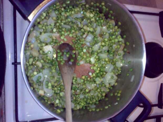 Cuando estén ligeramente dorados añadir 1 taza de guisantes secos y rehogar durante 3 minutos.