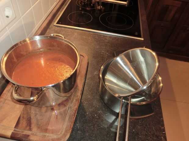 Vierta el puré en un filtro para obtener el último tomate sopa.