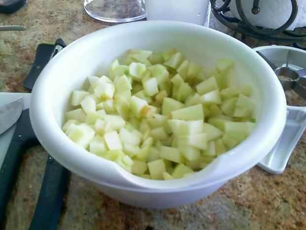 La cáscara y las manzanas de fuji. Luego, cortarlas en cuartos y luego picarlos en trozos aún más pequeños alrededor de 1/4 pulgadas.