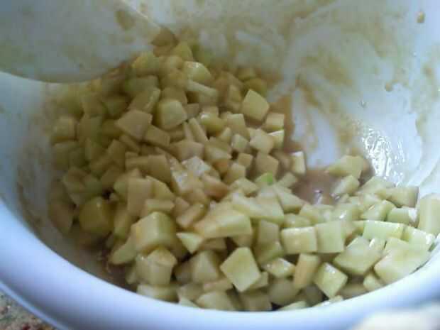 Mezclar los ingredientes secos (azúcar morena, azúcar, canela y harina) en un tazón y wisk ellos juntos. En otro tazón mezclar la húmeda los ingredientes (Extracto de vainilla, licor y huevo). Luego doblar en manzanas con una espátula o una cuchara grande. Capa de manzanas uniformemente.