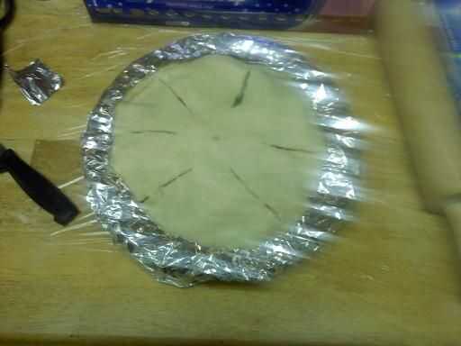 Doblar un trozo de papel de aluminio 12 pulgadas a la mitad. se deja cortar un semicírculo que es cerca de 7 1/2 pulgadas de diámetro desde el lado doblado, de modo que una de 2 pulgadas (aproximadamente) del borde. Desdoble la hoja y molde ligeramente sobre los bordes de la tarta.