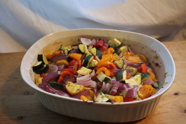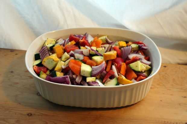 Picar todas las verduras y el ajo en pedazos de tamaño de un bocado agradables y mezcle en una fuente para horno.
