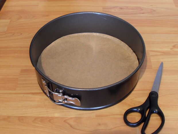 Engrasar los lados de un molde de tarta de 25cm y forre el fondo con papel de hornear.