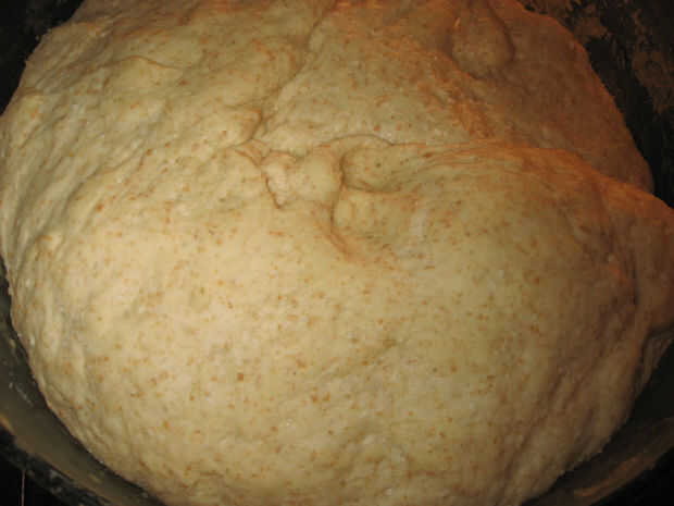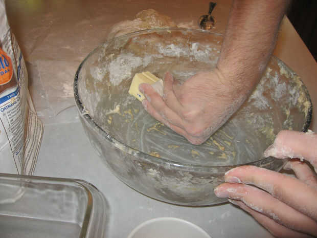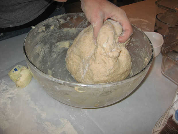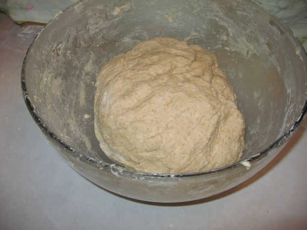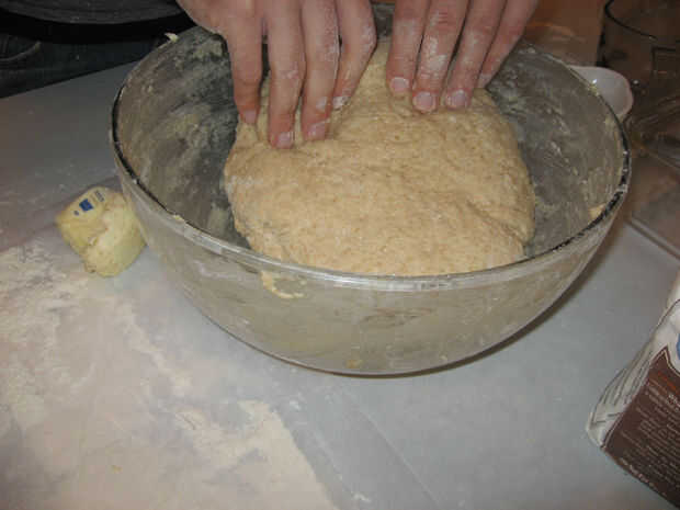 Mantequilla el recipiente de antes. (Tomar una barra fría de mantequilla y frotar alrededor de la taza que estaba utilizando, hasta que completamente con mantequilla. Usted puede limpiar y seque el recipiente antes de este paso, si usted realmente desea, pero no es totalmente necesario; la masa debe ser mucho menos pegajosa de lo que había sido después de ser amasado, así que no recoja el material en el recipiente, y en cualquier caso, lo que es en el tazón de fuente es justo lo que está también en la masa). Coloque la masa en el recipiente, luego voltéela, para que su superficie es también con mantequilla. (Así, no se seque mientras se levanta.)