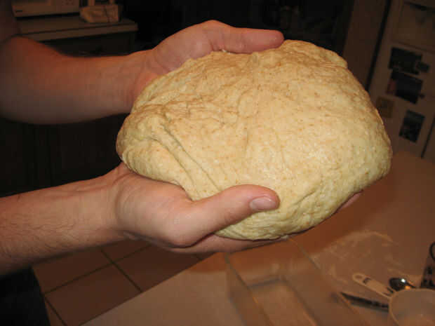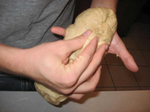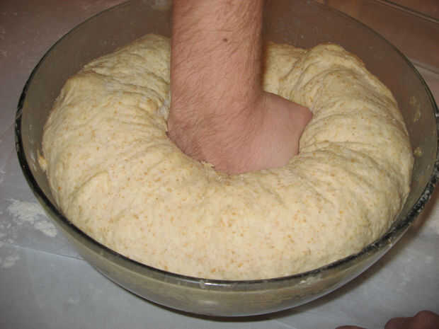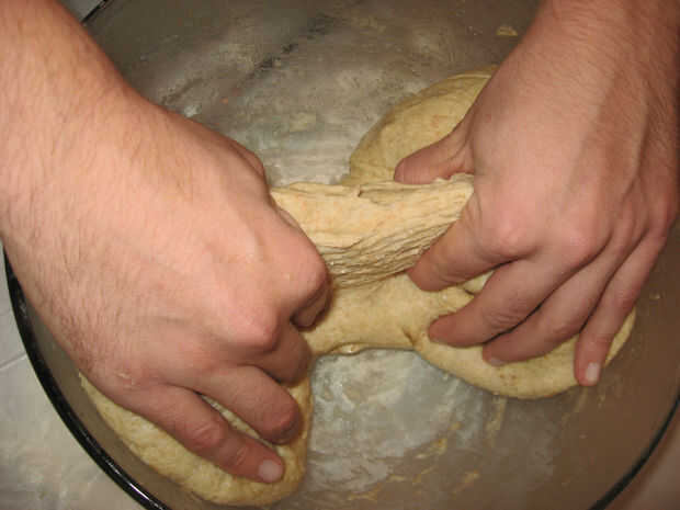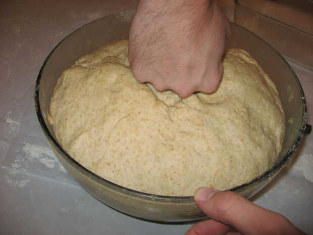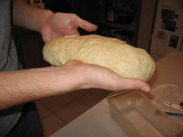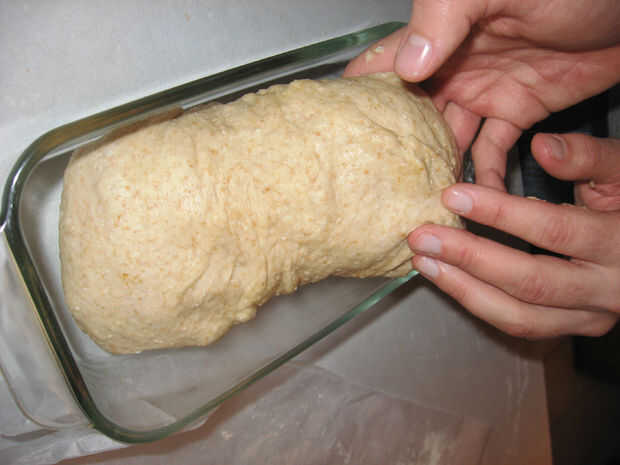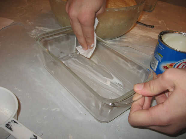 Aplaste la masa resucitada. (Apretar un puño en la parte superior levantada de la masa. Mucho del bióxido de carbono la levadura ha estado produciendo durante el levantamiento se soplo--no te preocupes, eso es lo que se supone debe para suceder!) Dividir la masa en dos, luego dar forma a los panes y coloque cada pan en un molde engrasado. (Formar en panes es un poco difícil de transmitir a través de imágenes. Tomar una masa mitad y alargados y aplanar un poco. Luego, doblar todos los lados debajo de la masa, a partir a lo largo de la dimensión más larga, luego metiendo nuevamente los extremos más cortos, la idea es formar una superficie tensa. Pellizcar los bordes doblados bajo juntos, entonces lugar el pan en un pan de pan aplastado de lado hacia abajo. Repita para la otra masa la mitad).