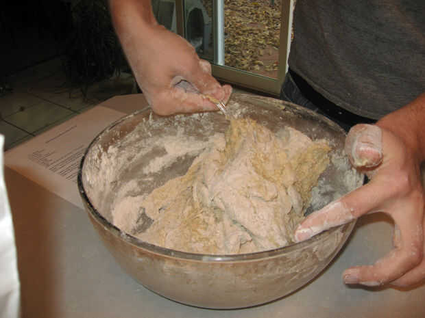 Este paso con el tazón de fuente se hace cuando la masa empieza a parecerse a la masa en la imagen final. En ese momento, la masa se tira lejos del tazón de fuente considerablemente y sólo sentirás algo pegajosa al tacto.