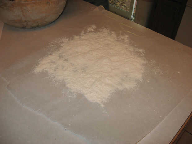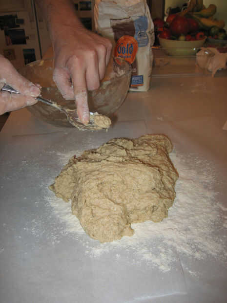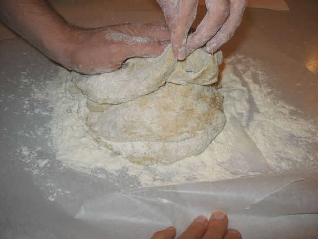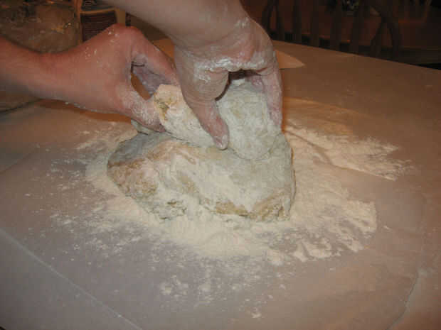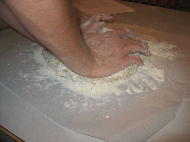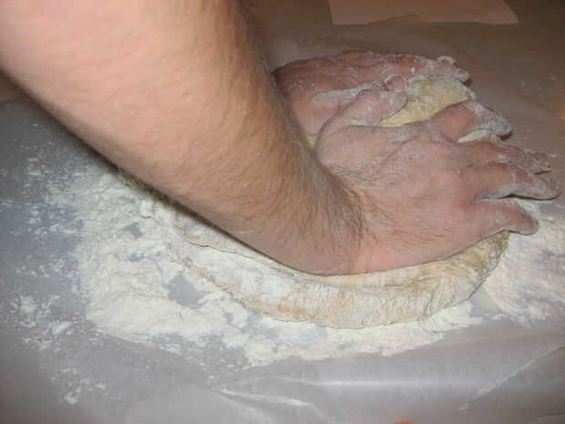 Cubrir las manos en harina, luego voltee la masa por lo que también está cubierto de harina. Luego empezar a amasar: doblar la masa a la izquierda, luego con el talón de su empuje de palma hacia abajo y lejos de usted; Luego doblar el borde de la masa hacia usted mismo y doble espalda, después el empuje otra vez con el talón de la palma. Repita hasta que la masa esté uniforme y elástica, unos dos minutos.