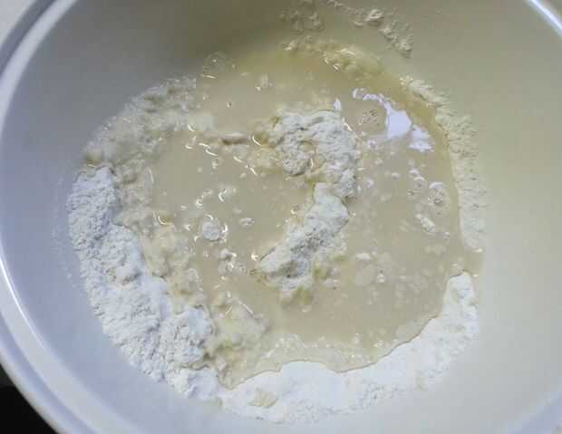 Después de 10 minutos, añadir la mezcla de levadura y agua a la harina y mezclar muy bien.