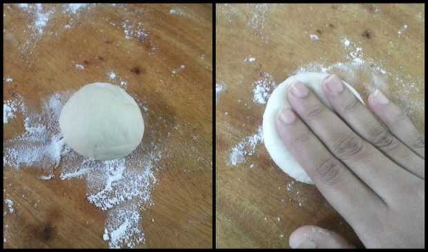 Coloque una bola de masa sobre una superficie plana y presione con los dedos para aplanarla. Del mismo modo le aplane las otras bolas de masa.