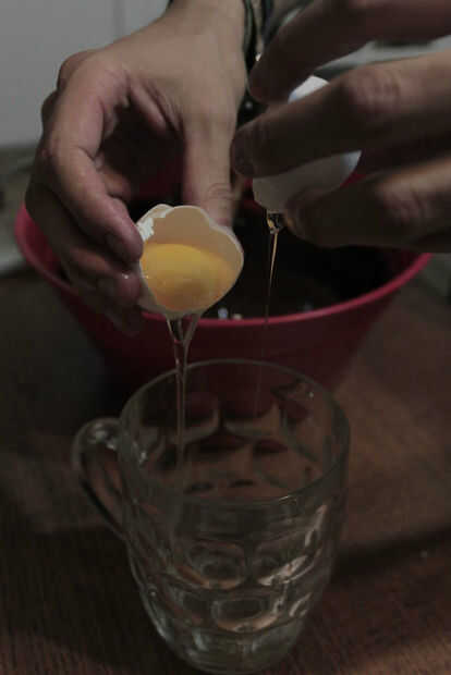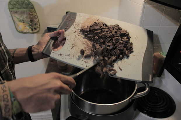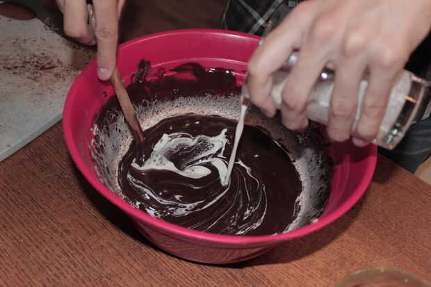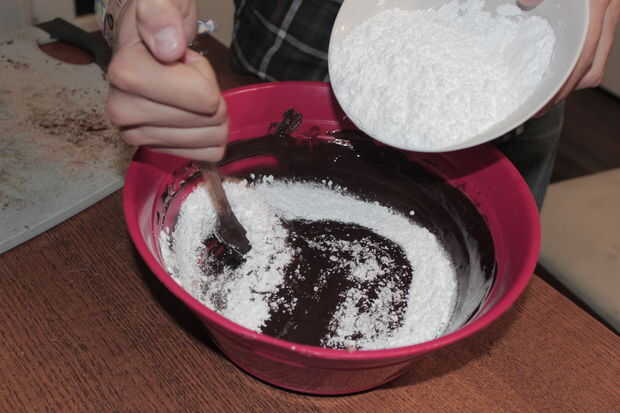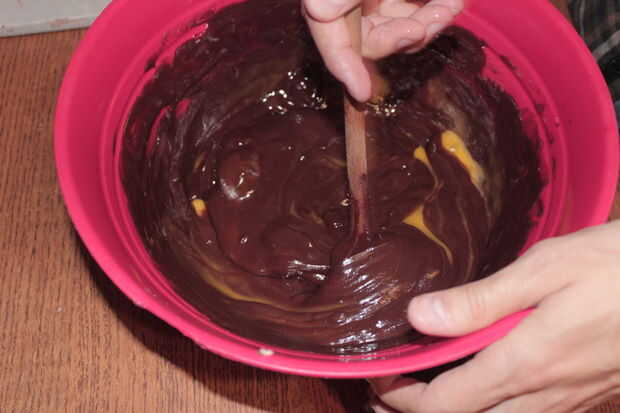 - Poner el chocolate en un cuenco. Añadir la mantequilla progresivamente en pequeños trozos hasta que derrita el chocolate. Añada el azúcar de las yemas, crema, huevo. Revolver siempre hasta que se suavice antes de poner el siguiente ingrediente.