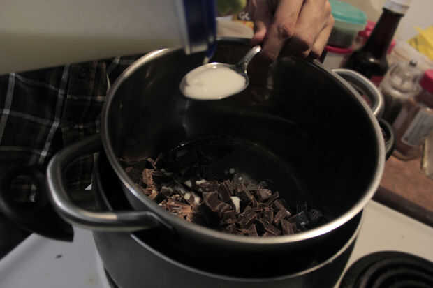 - Poner una cacerola en un baño de agua a fuego medio y poner el chocolate en él. Añadir la cuchara de leche para el chocolate derretir más fácilmente. Mezclar de vez en cuando hasta que la mezcla esté suave.