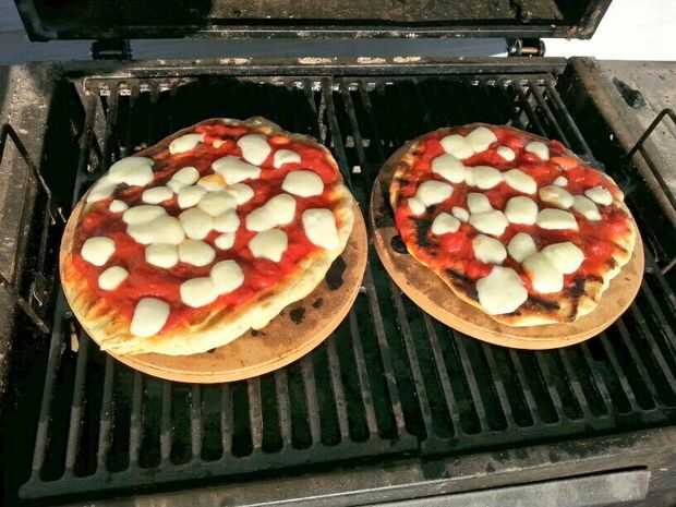Para solucionar el problema de la quema de la corteza mientras que los ingredientes de la calefacción, he a menudo a la parrilla todas las cortezas primero. Luego poner dos piedras de pizza a la parrilla y déjelas calentar. Cuando estén listos puse la corteza en las piedras, agregar los ingredientes y cerrar la parrilla para ellos al calor. De esta manera los toppings son agradables y calientes con queso derretido y la corteza es ligeramente ahumado y no quemado. También es una buena cosa a hacer si tienen una fiesta y quiero hacer un montón de pizzas.