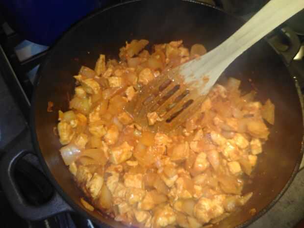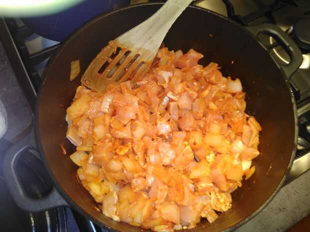 Whille freírlos los sindicatos un puré de tomate, cortar las pechugas de pollo en dados, cuando los sindicatos estén transparentes agregar el pollo y freír hasta que el pollo es de color marrón.
