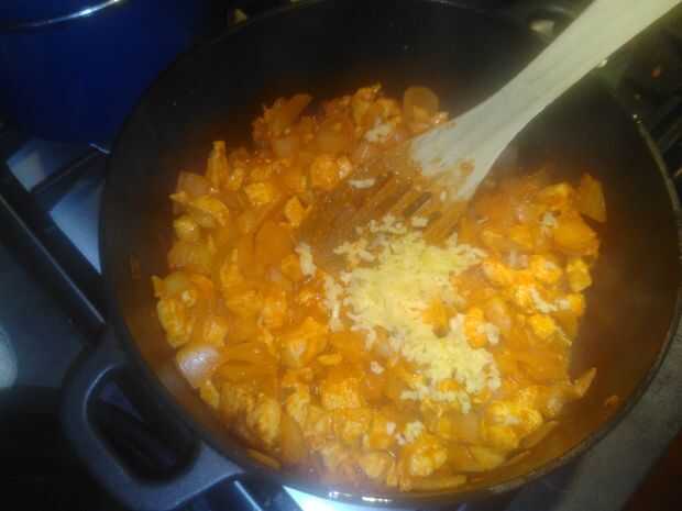 machacar el ajo y ponerlo en la sartén revuelva y fría durante 1 o 2 minutos.