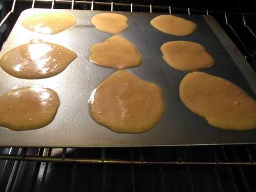 Rociar tus galletas con aceite de cocina. Mezcla de una cuchara sobre la hoja, aproximadamente una cucharada por porción. Alisar la masa hacia fuera, asegurándose de que los centros son un poco más planos que los bordes. Su objetivo es crear un producto muy fino. Van a extender un poco en el horno, así que no trate de conseguir más de 8 o 9 en la hoja a la vez.