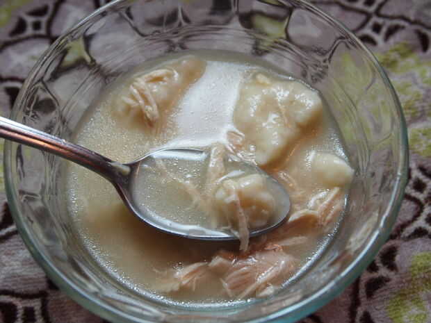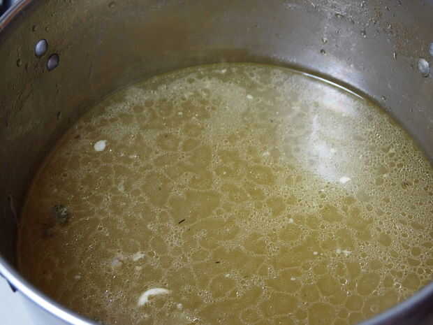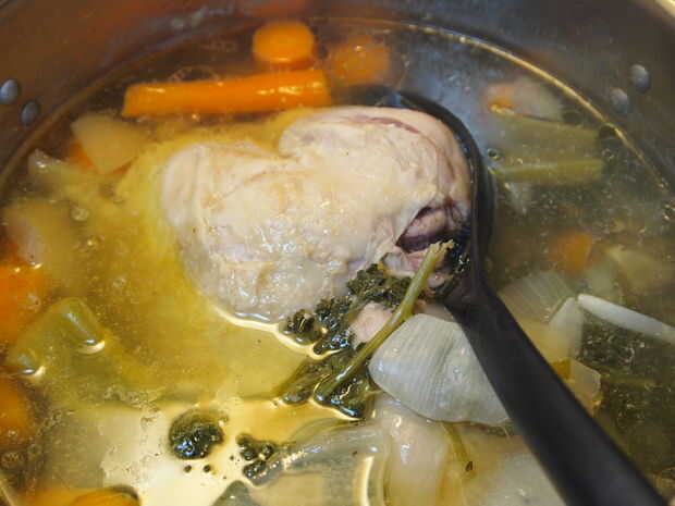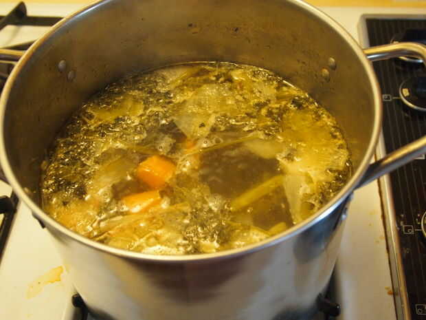 El caldo es deliciosa y rica en sabor y nutrientes. Yo generalmente vierta porciones de mina en contenedores de 1 taza que se almacenarán en el congelador. También hago sopa de pollo y bola de masa hervida y el caldo de pollo - mi hijo le encanta!