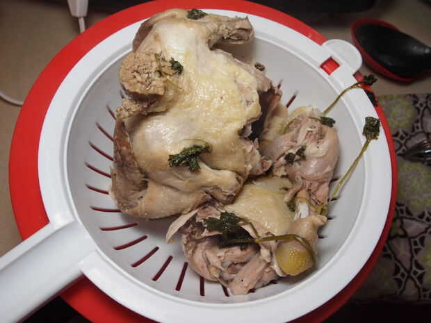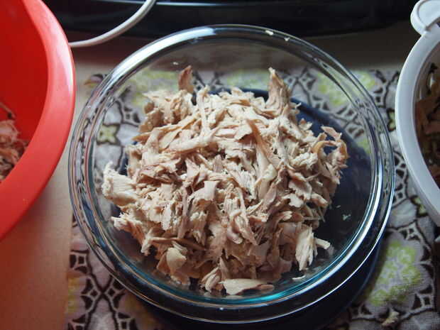 Una vez que el pollo se cae los huesos fácilmente, necesita sacar de la olla. Tengo un colador sobre un recipiente listo para esto. Entonces cuidadosamente mediante dos pares de pinzas o lo tengo que agarrar los trozos de pollo de la olla poner en el tazón de fuente. Me saque todas las piezas y deja que se enfríe en el recipiente. Cuando haya enfriado lo suficiente como para tocarlo, me tire todo el pollo de los huesos y poner en un recipiente limpio de nuevo.