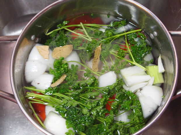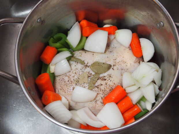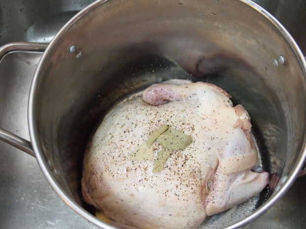Coloque el pollo en la olla. Luego poner poco de sal y pimienta, antes de poner a un lado así que usted puede cortar las verduras. Cortar zanahorias largas de 3-5 en trozos, unos tallos de apio y dos cebollas. Luego, sacar el ajo y que necesitará unos 8 dientes de ajo. Tomar un manojo grande de perejil y lavarlo y ponerlo con todas las verduras cortadas. Si no tiene todos los ingredientes a mano, usar lo que tienes. Poner todas las verduras en la olla en y alrededor del pollo. Luego, poner 2 hojas de laurel en él también. Si usted tiene pimienta negra entera o granos de pimienta, tomar una cucharada de ellos. Luego use la parte posterior de una sartén de saltear o algún otro objeto para los crack, luego colocar en la olla. Si no tienes esto, sólo tiene que añadir alguna pimienta en lugar de otro.Cubra el pollo y las verduras con agua y colocar en estufa. Poner a hervir, luego reducir el calor y déjelo a fuego lento durante un par de horas. Comprobar regularmente - y cuando veas la espuma colocar en la parte superior el agua, una cuchara y nivelado hacia fuera. Si no se consigue todo, lo bien - apenas consigue tanto hacia fuera como sea posible. Cuando simmer mina, coloque la tapa sobre la olla pero deja una pequeña grieta o abertura. Cuando en él, utilice un par de pinzas para tirar el pollo - si lo hace y empieza a desmoronarse fácilmente - el pollo está listo para salir.