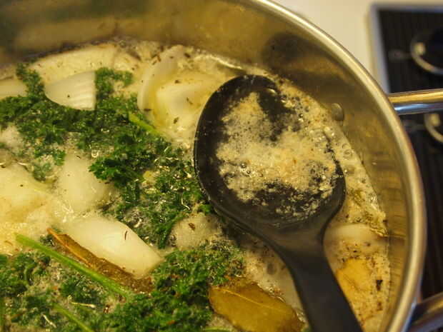 Dejar hervir a fuego lento mientras usted tenga gusto. Luego, use un colador nuevo para deshacerse de los huesos. Deje que su caldo de enfriar. Se recomienda para transferir a la nevera para que la grasa puede llegar a la cima y ser desnatada. Una vez que esté listo para usar el caldo, usted probablemente querrá agregar sal adicional.