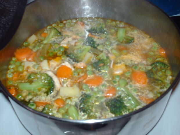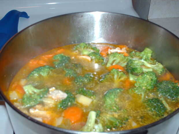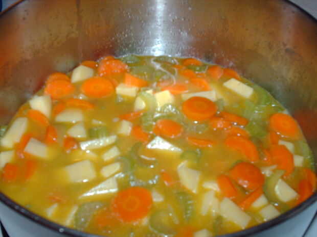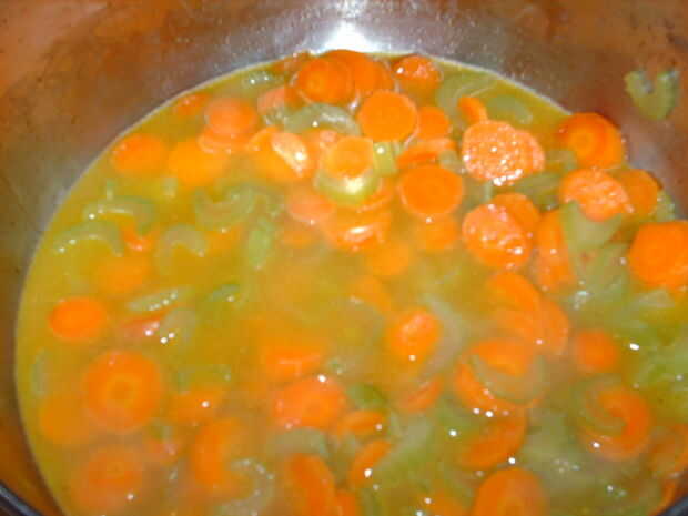 3. después de que aparezcan más suaves y ligeramente cocidos agregar suficiente caldo de pollo para cubrirlos (aprox. un tercio de la caja de cartón). Coloque la tapa sobre la olla. Esto permite que los vegetales al ser cocidos al vapor, por acelerar el proceso de cocción. Llevar a ebullición y cocer a fuego lento durante 5-7 minutos.