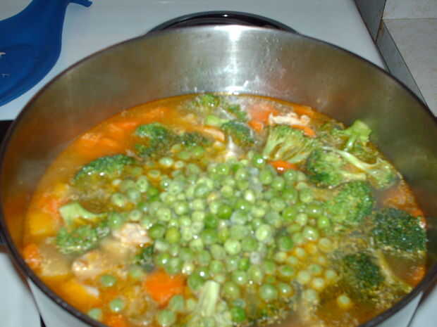 7. cocinar a fuego lento hasta que las verduras han alcanzado su dulzura deseada. Añadir el brócoli y los guisantes, plegándolas completo incorporados les. Un deje hervir por otros 5 minutos, o hasta que el brócoli y los guisantes se cocinan a través de la cubierta.