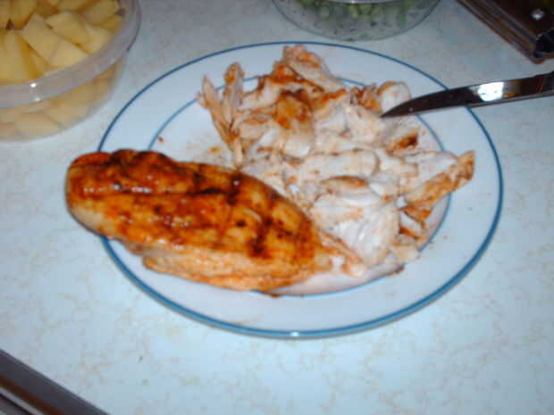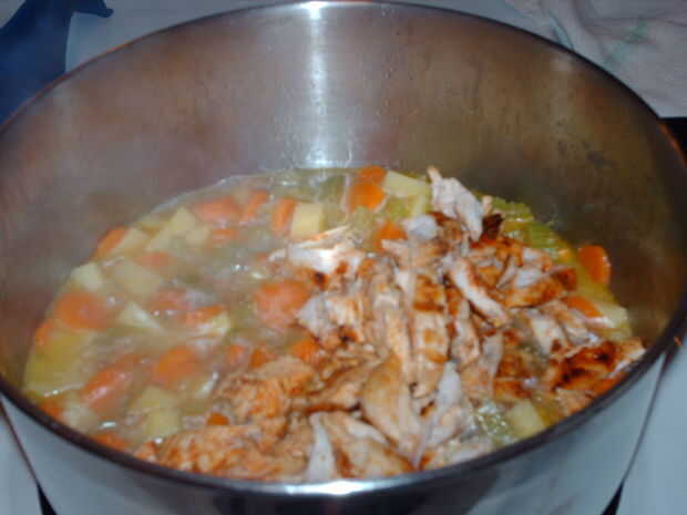 5. mientras tanto, cortar o separar el pollo en trozos de tamaño. Añadir esto a la mezcla hirviendo. Añadir el caldo restante en la caja de cartón.