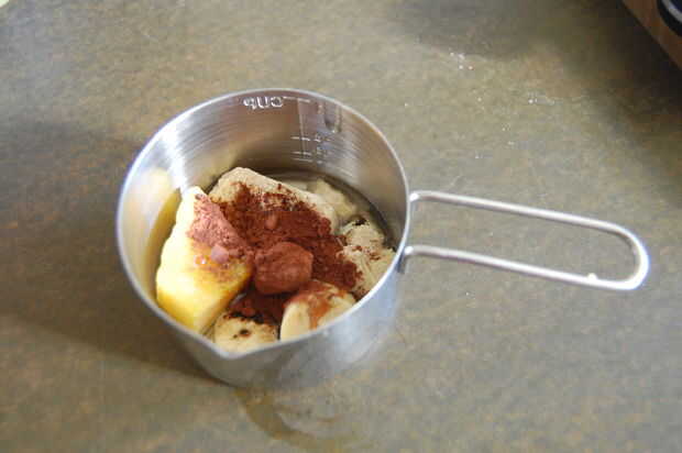 Poner todos los ingredientes juntos en un recipiente pequeño que puede verter fácilmente de y que puede colocar en una cacerola con agua caliente. Estas tazas medidoras de acero inoxidable fueron perfectas.
