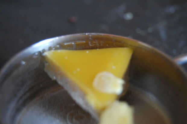 Para medir los trozos de cera de abejas (o manteca de cacao), llenar una taza pequeña con agua fría, luego se retira la cantidad de agua que se desea medir. Flotar pedazos de cera en la taza hasta la marca.