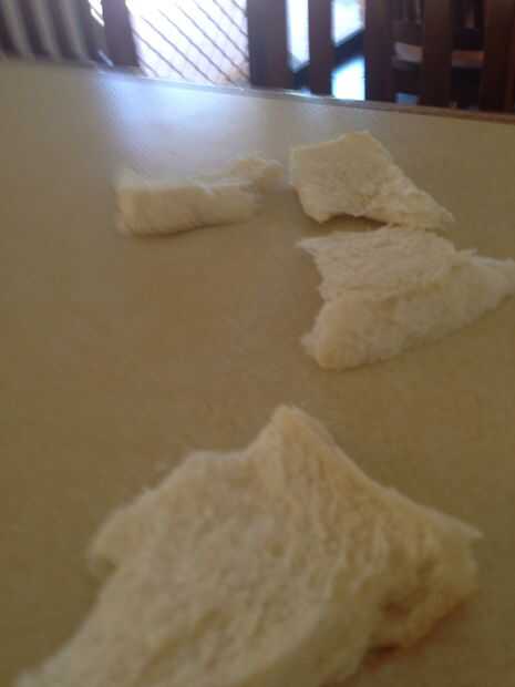 Poner el horno en 160•c y obtener un aceite de oliva ramekin y extensión por todas partes. Tomar 2 piezas de pan y cortar la corteza, entonces Troce el pan en pedazos grandes pero no tan grande entonces difundir cualquier mermelada que como en el pan, luego pone el pan.