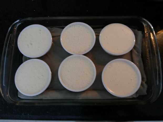 6. colocar los moldes de flan en la toalla de cocina, en el plato más grande.